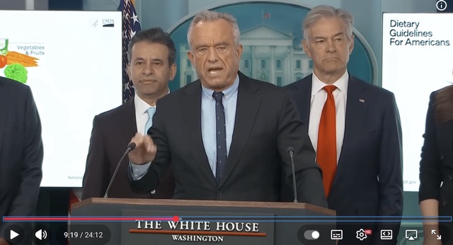 大統領は、ここにいる二人――USDA(農務省)のロリンズ長官と、HHS(保健福祉省)のケネディ長官――に、この極めて重要なプロジェクトで協力するよう指示しました。そして本日、両名はここで、アメリカの2025〜2030年版食事ガイドラインを公式に発表します。